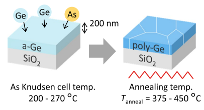 a-Ge(amorphous Germanium:비정질 저마늄)에 Aa(비소)를 적당량 도핑한뒤 낮은 온도의 공정인 SPC , laser annealing , CVD , MIC 등을 사용하여 poly-Ge로 만든뒤 slow annealing (375℃)까지 진행하면 grain size는 최대가 되고 전자 이동도노 최고값을 얻을 수 있다고 한다. grain size가 클수록 grain boundary scattering이 줄어드는 장점이 있다.